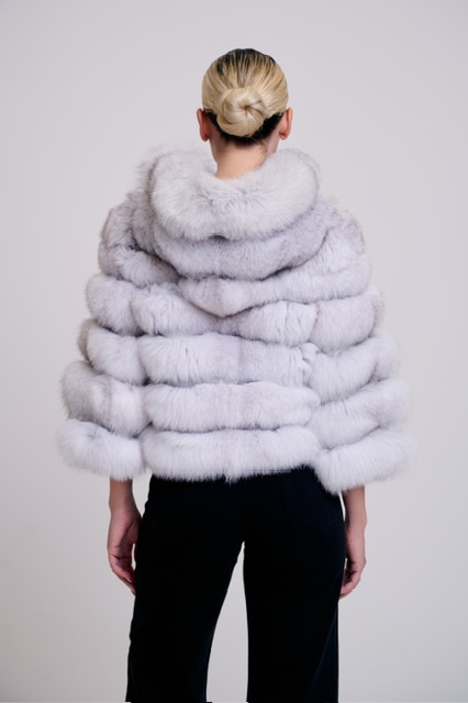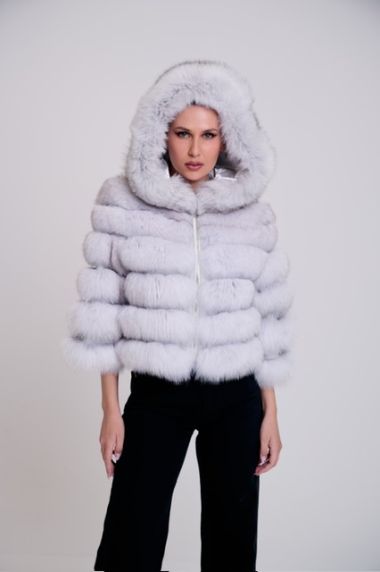 Λευκό μπουφάν από γούνα αλεπούς με κουκούλα.