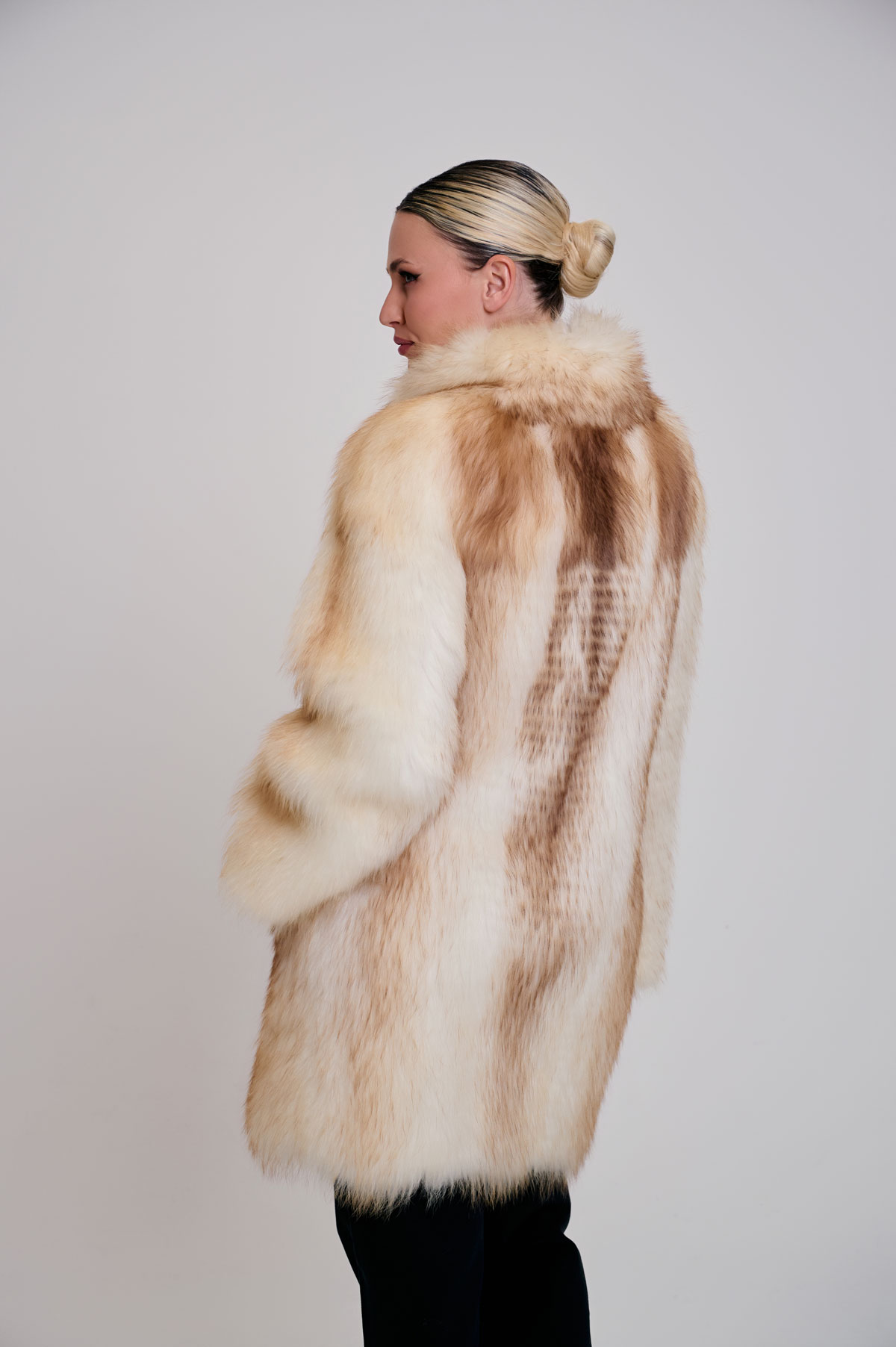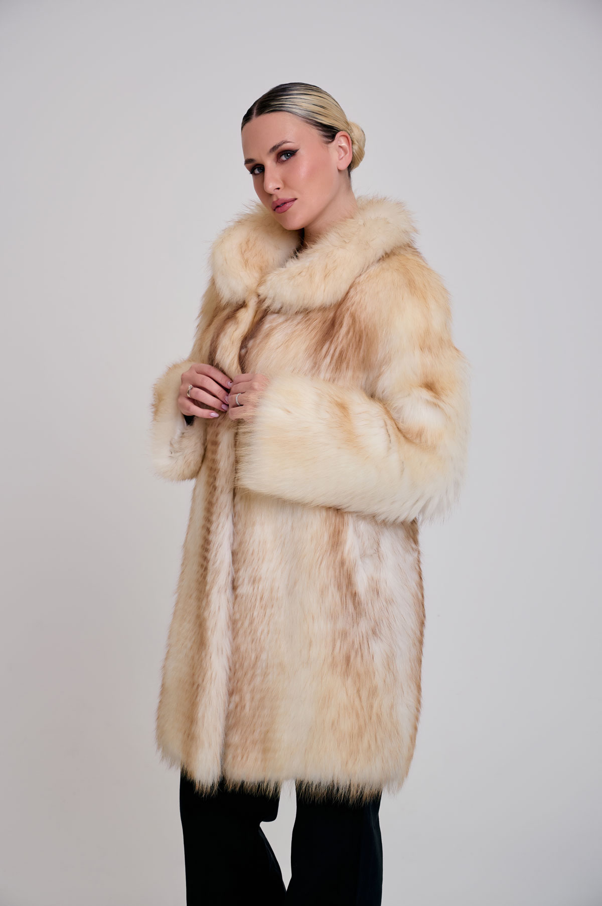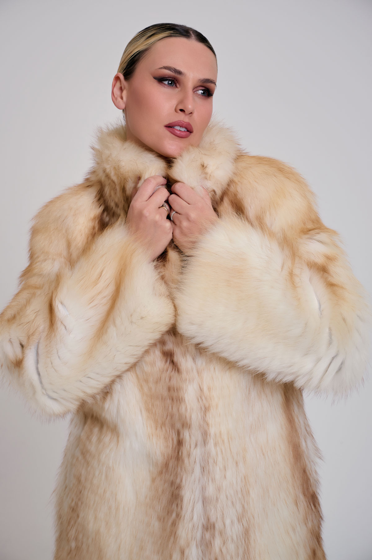 Μακρύ μπουφάν από γούνα αλεπούς σε μπεζ απόχρωση.