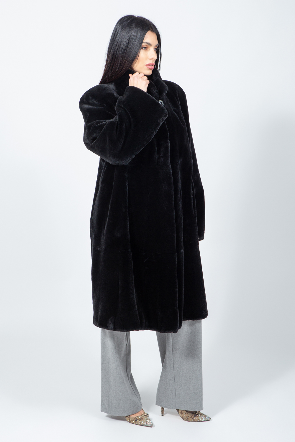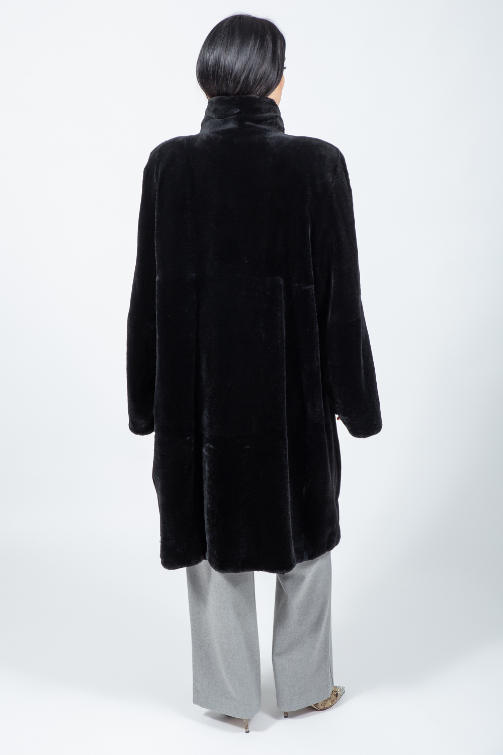 Μακρύ μαύρο μπουφάν από γνήσια γούνα κουνελιού.