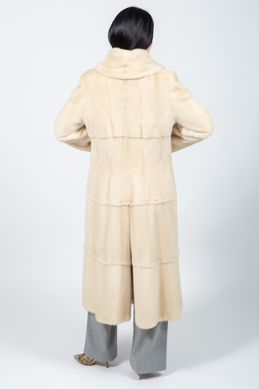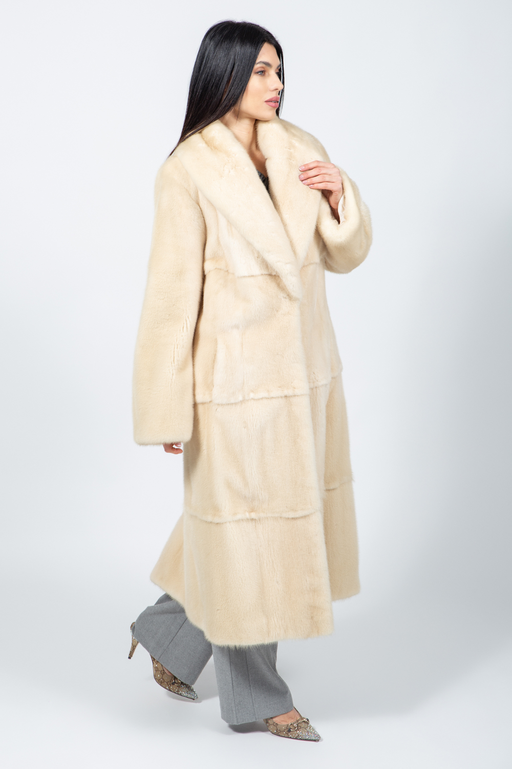 Μακρύ μπουφάν από γνήσια γούνα βιζόν σε κρεμ απόχρωση.