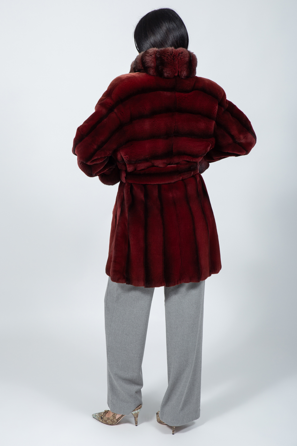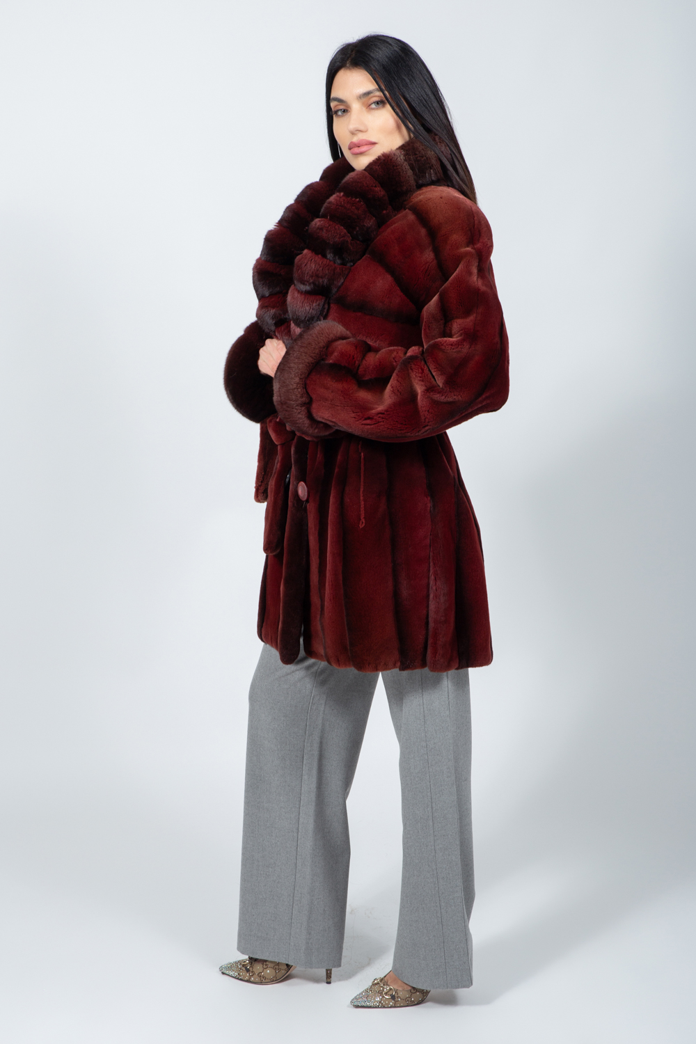 Μπουφάν από γούνα βιζόν και τσιντσιλά σε μπορντό/καφέ.