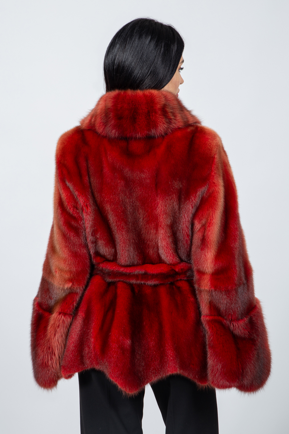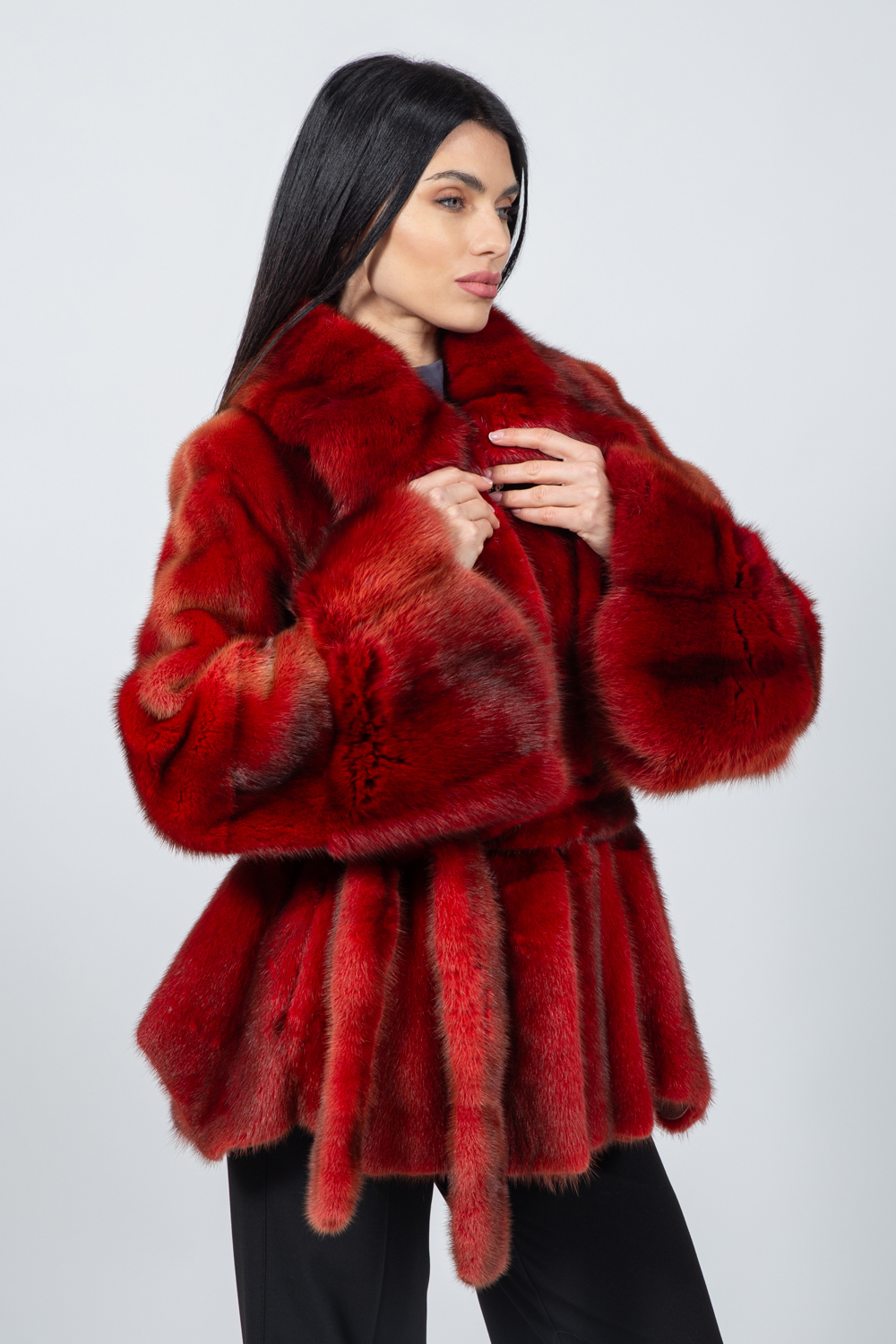 Κόκκινο μπουφάν από γνήσια γούνα βιζόν με ζώνη.