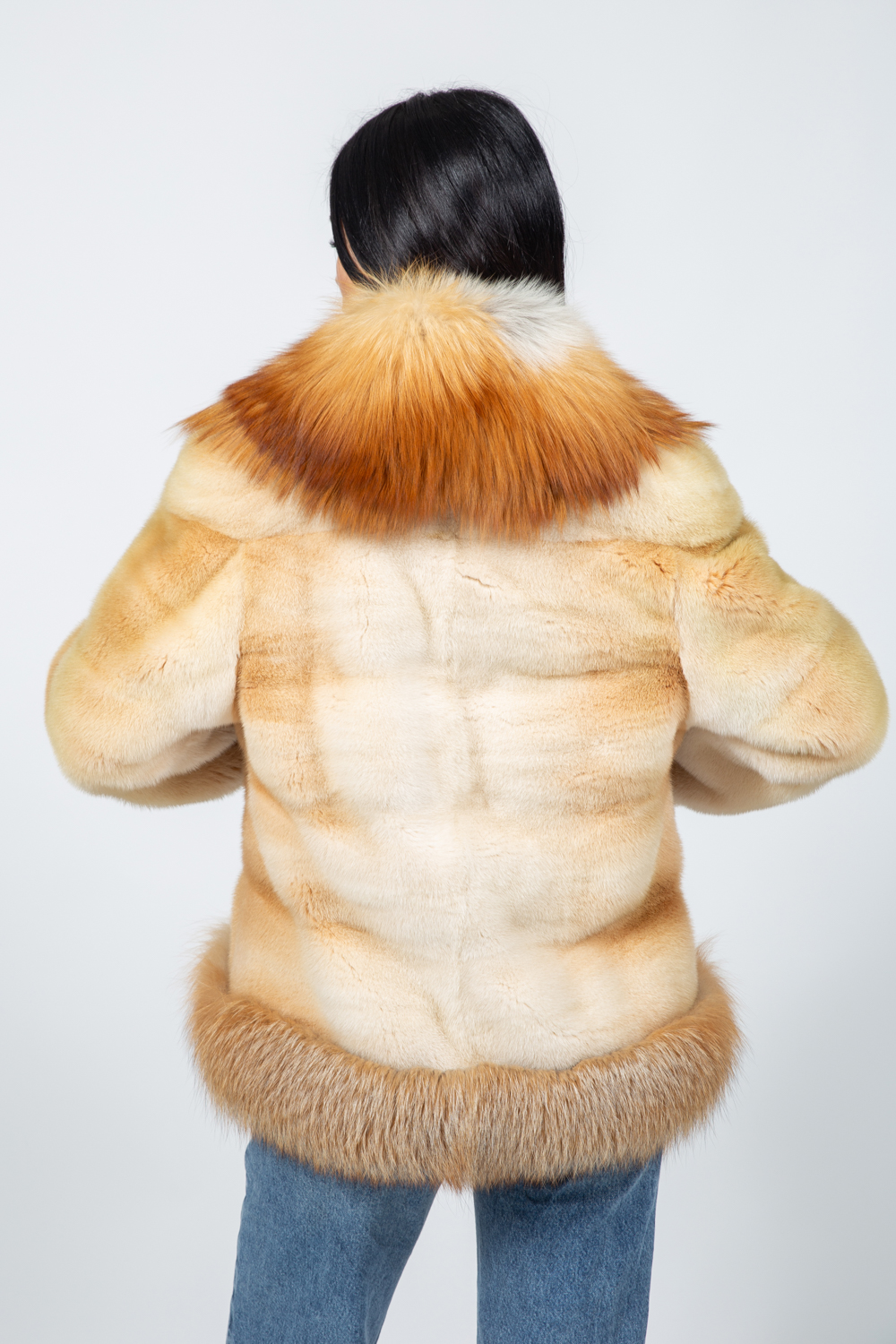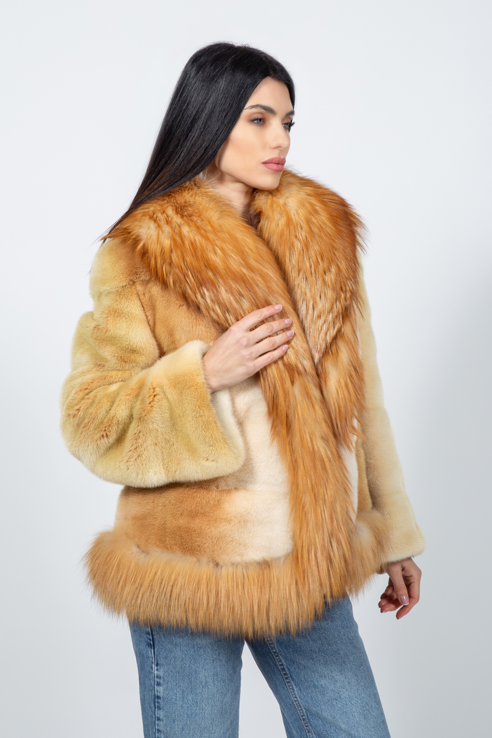 Μπουφάν από γούνα βιζόν και αλεπούς σε χρυσή απόχρωση.