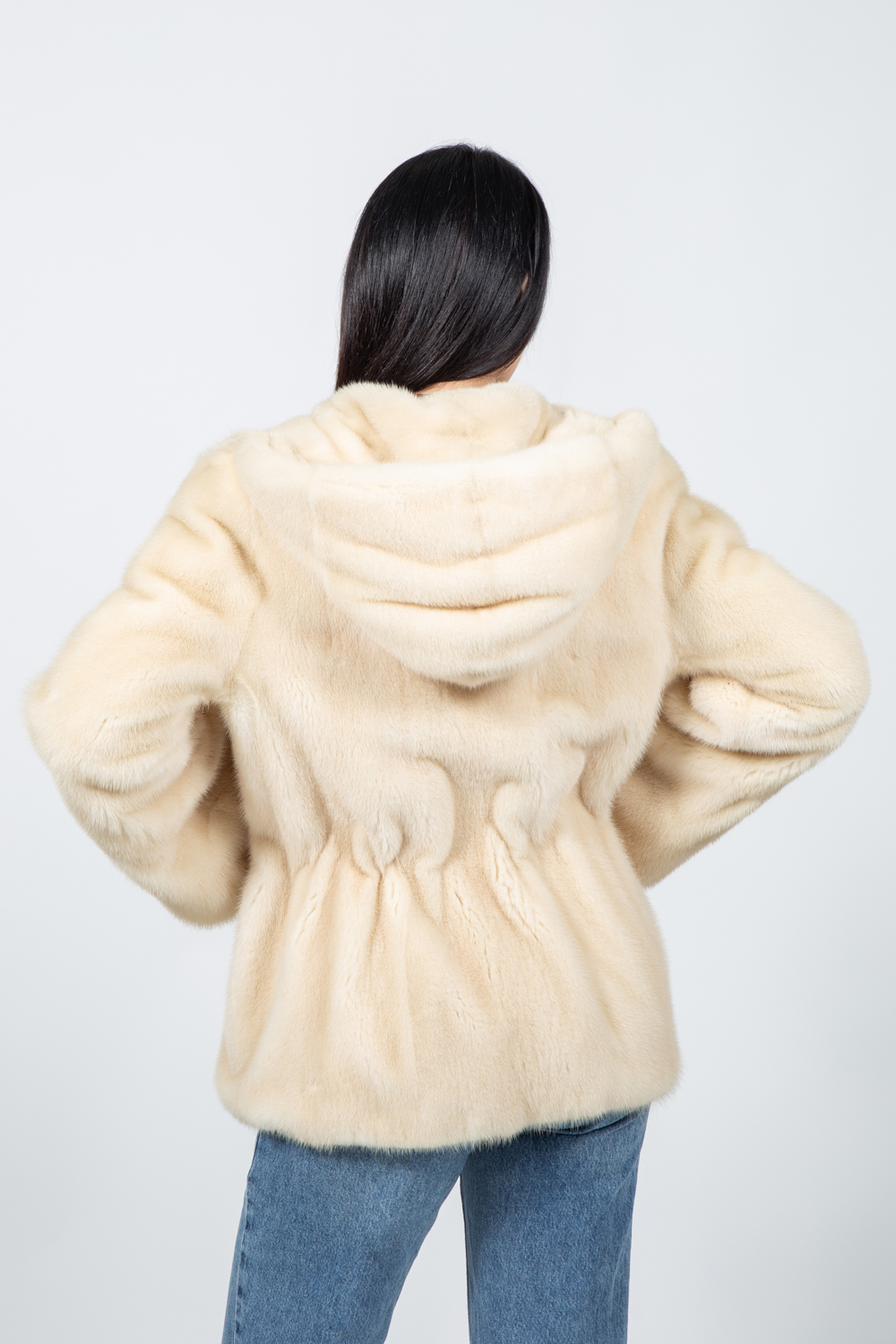 Μπουφάν από γούνα βιζόν σε κρεμ απόχρωση με κουκούλα.