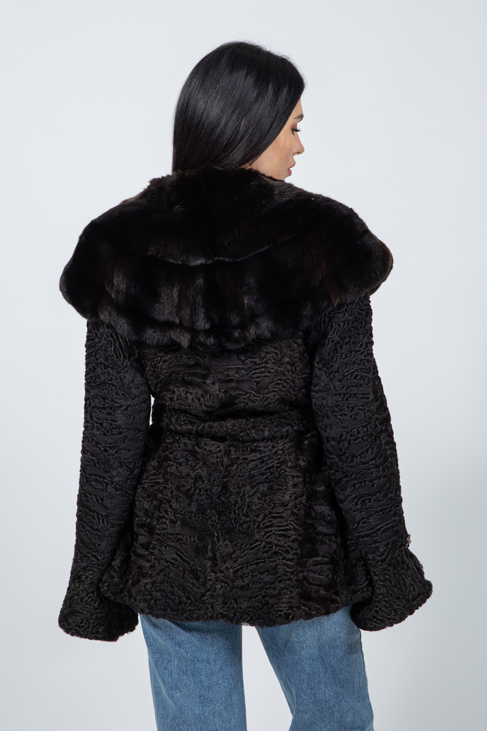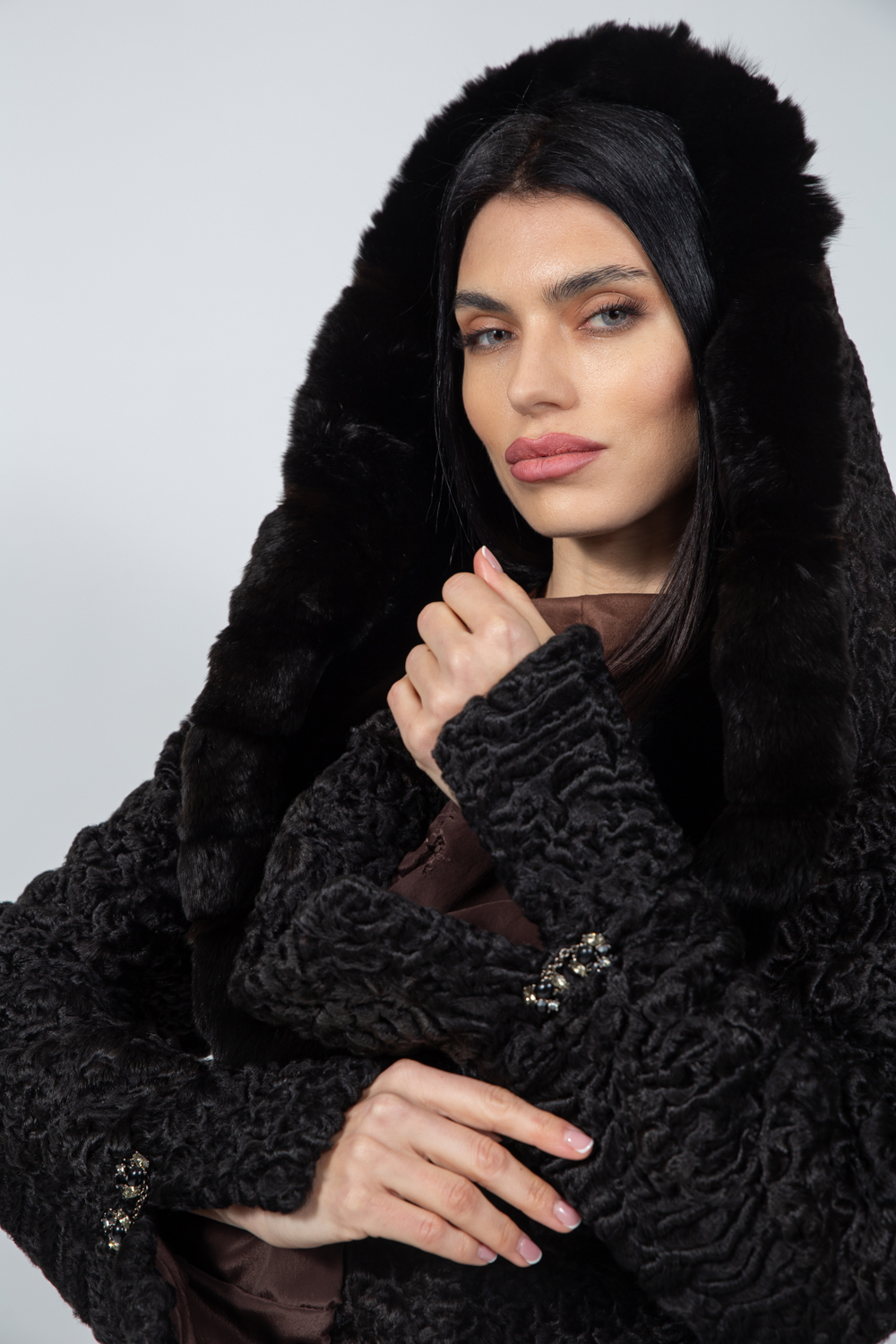 Μαύρο μπουφάν από γούνα αστραχάν και τσιντσιλά με ζώνη και κουκούλα.