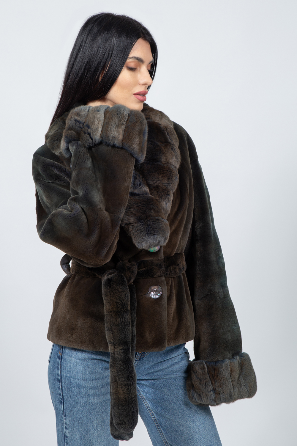 Μπουφάν από γνήσια γούνα βιζόν σε γραφίτη απόχρωση, με ζώνη.