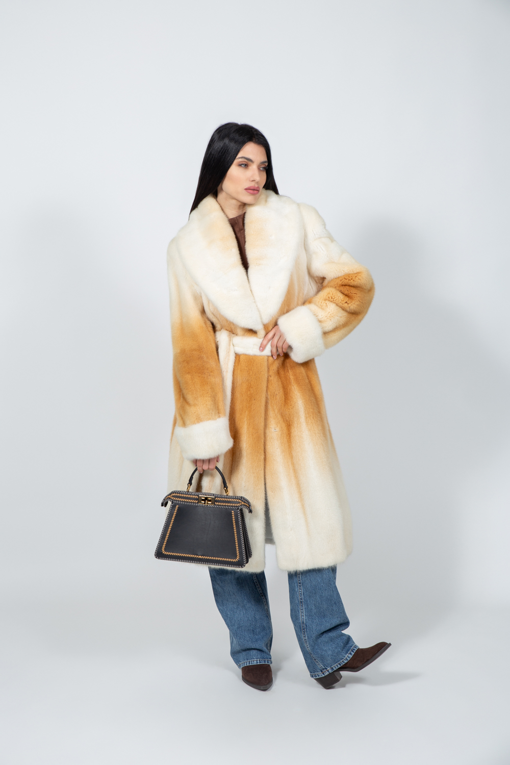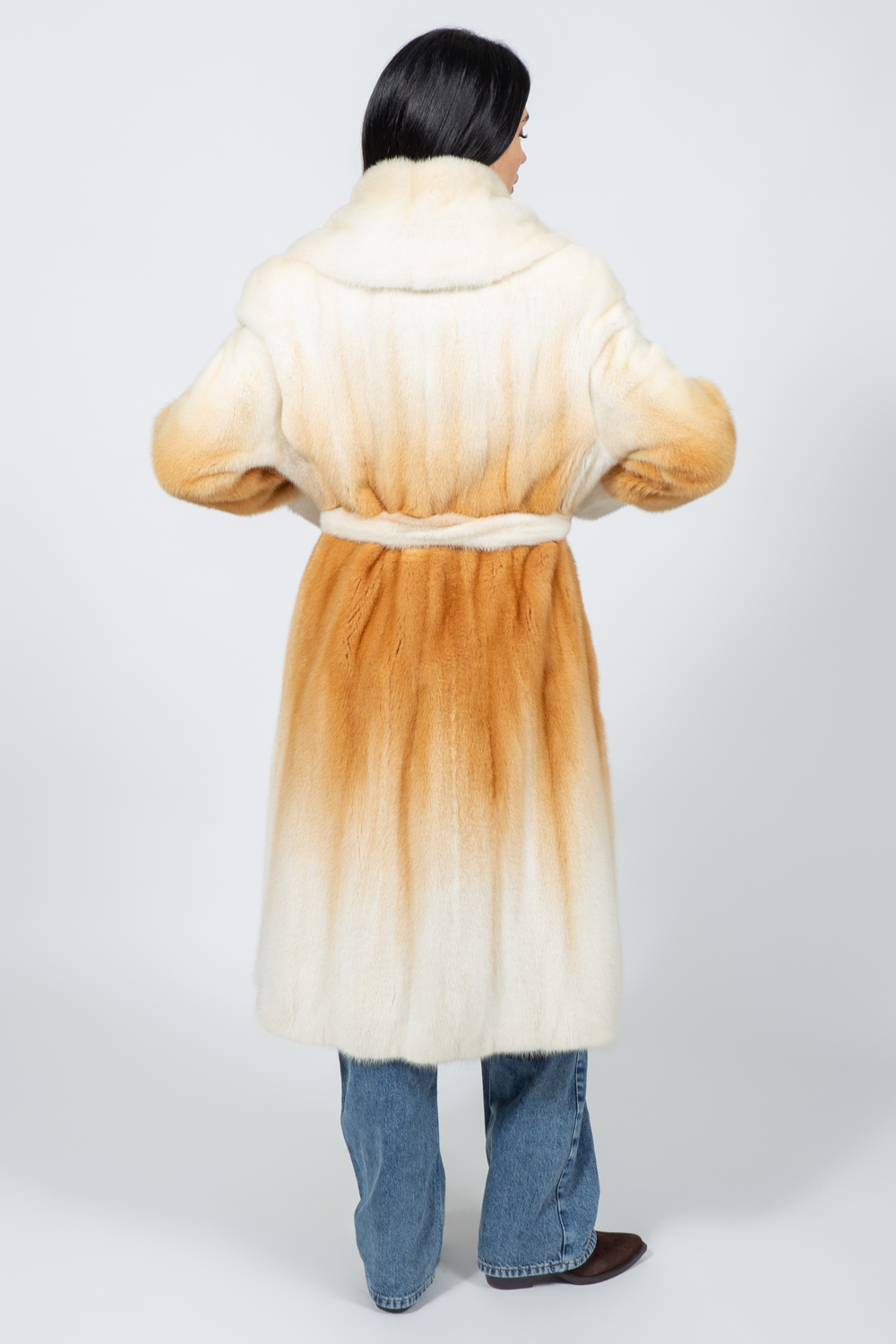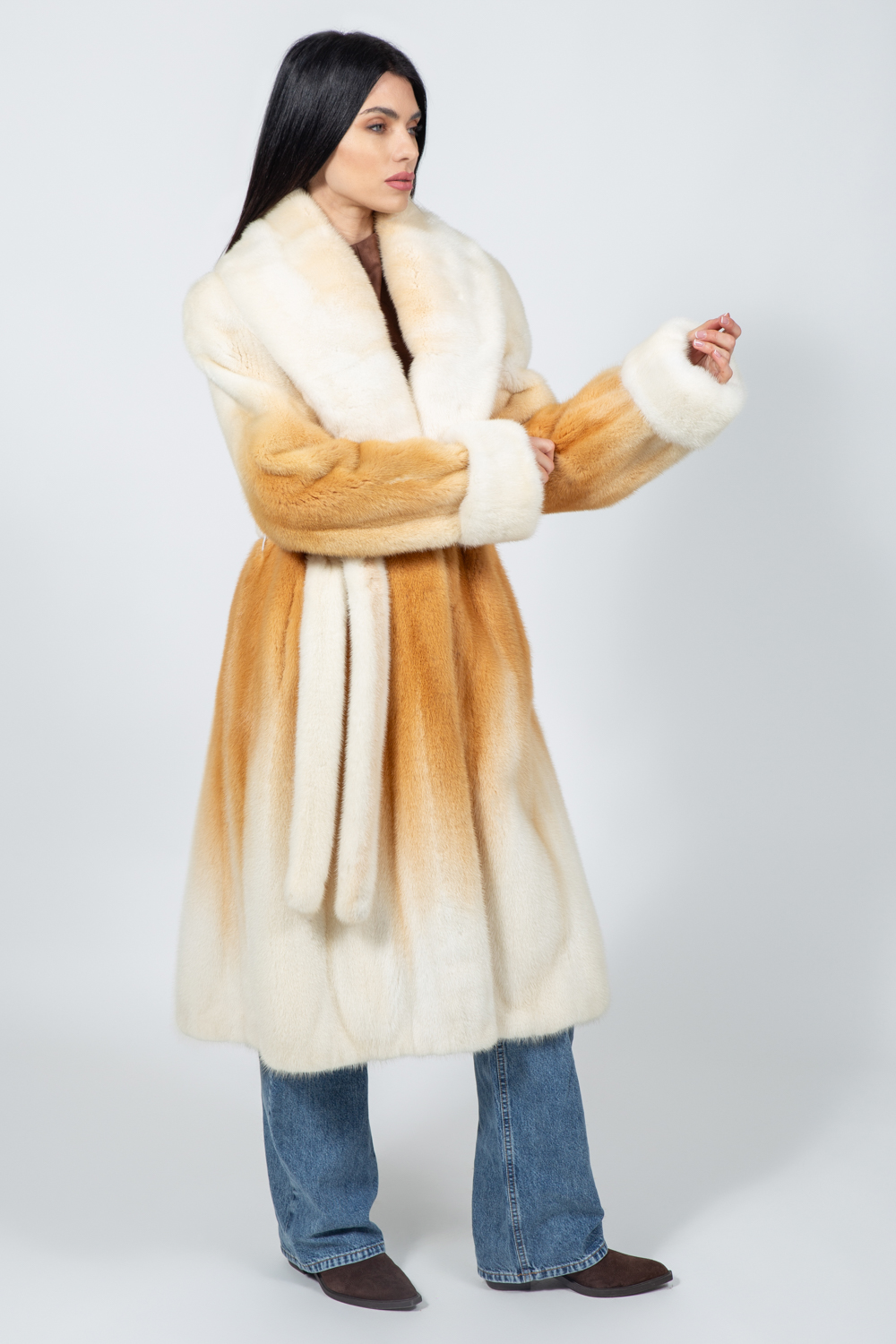 Μπουφάν από γνήσια γούνα βιζόν σε κρεμ και μπεζ απόχρωση, με ζώνη.