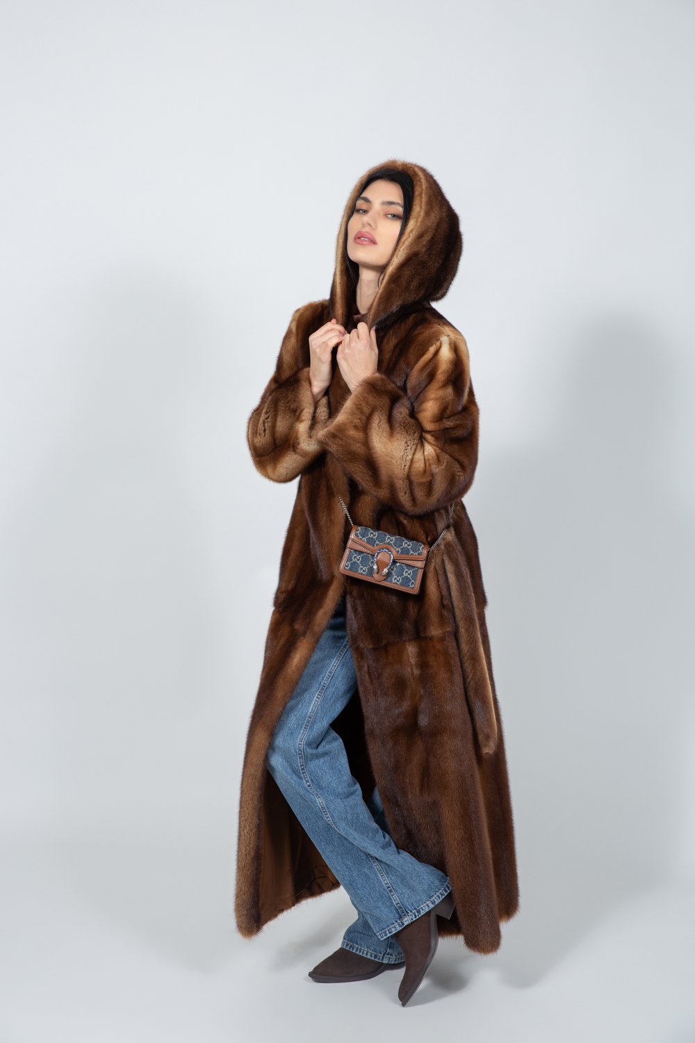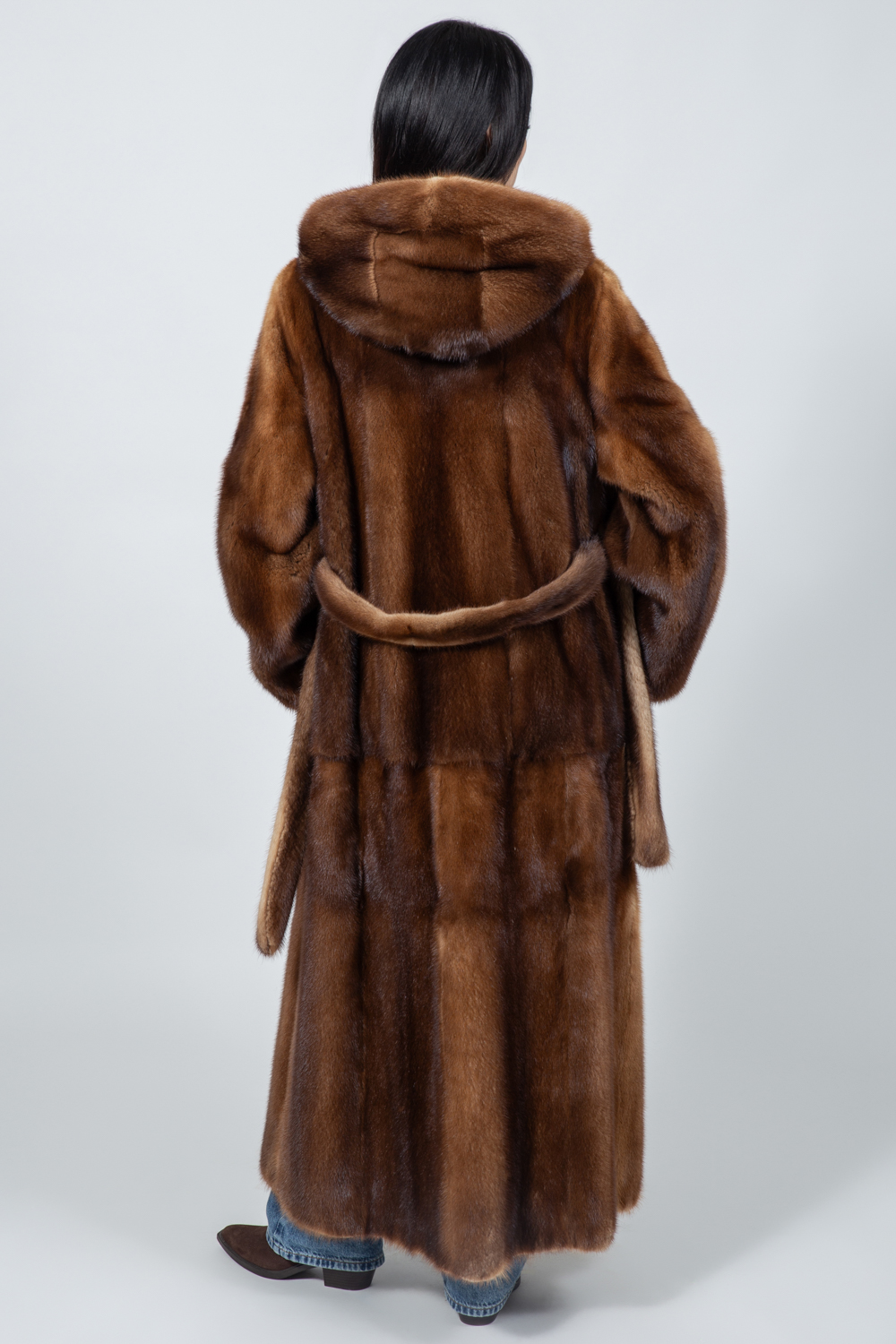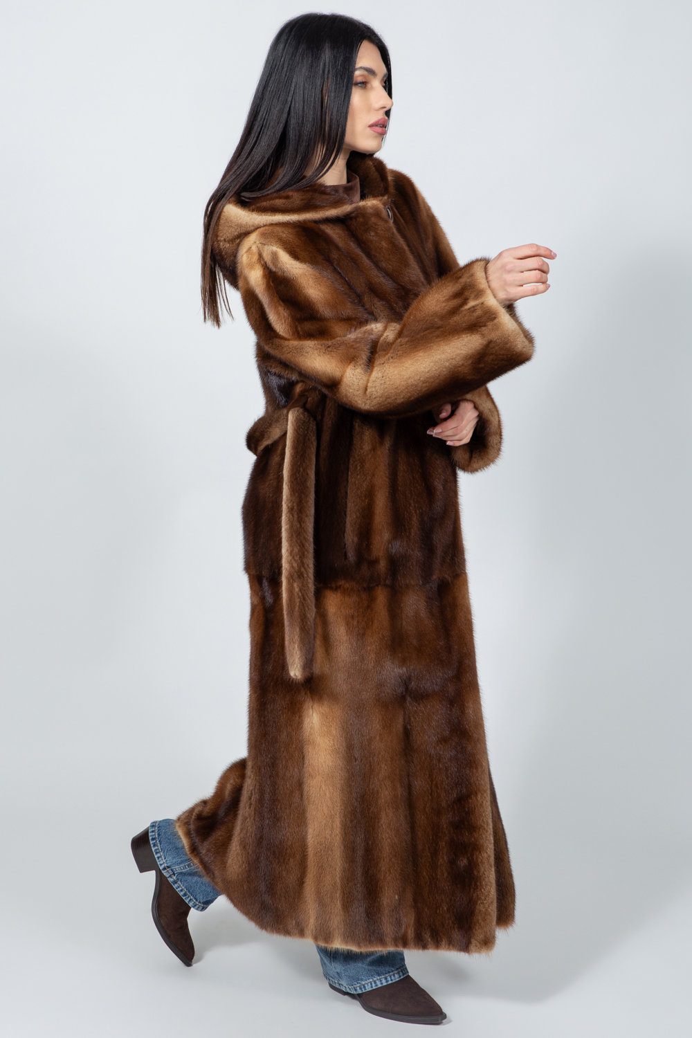 Καφέ μπουφάν από γνήσια γούνα βιζόν με ζώνη και κουκούλα.