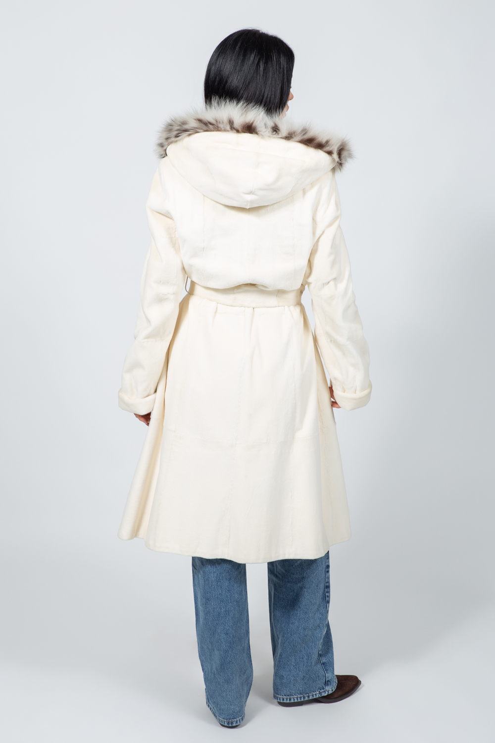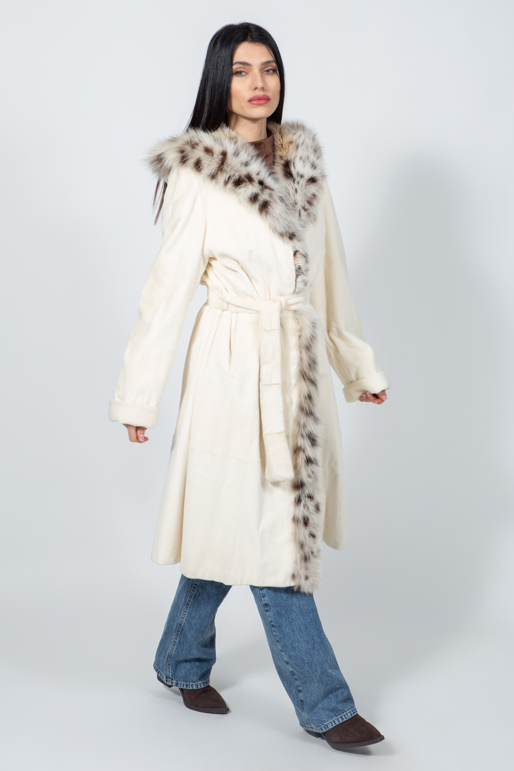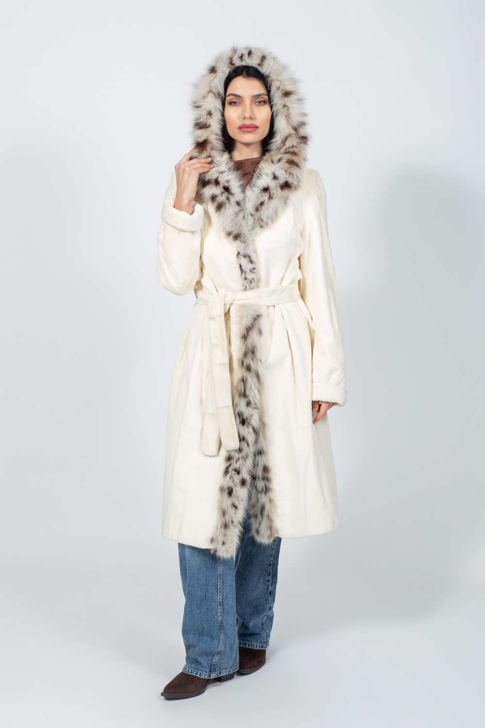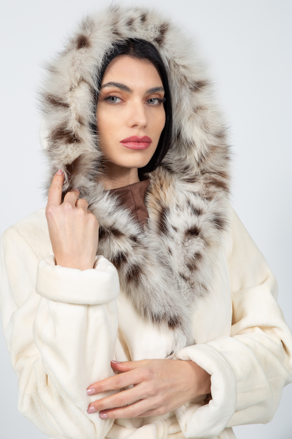Μακρύ λευκό μπουφάν από γούνα βιζόν και λύγκα, με κουκούλα και ζώνη.