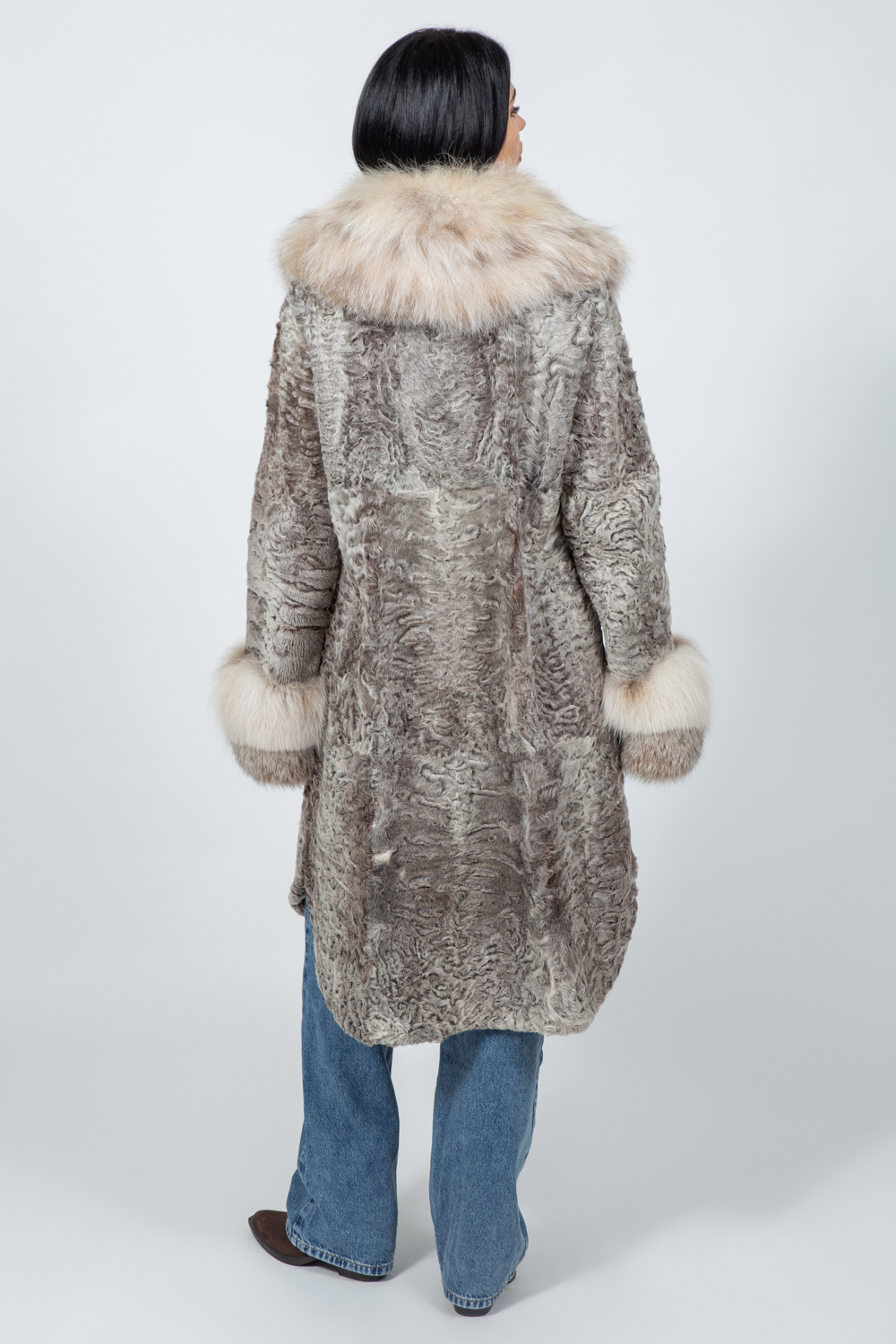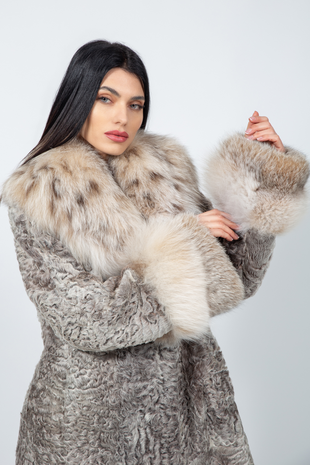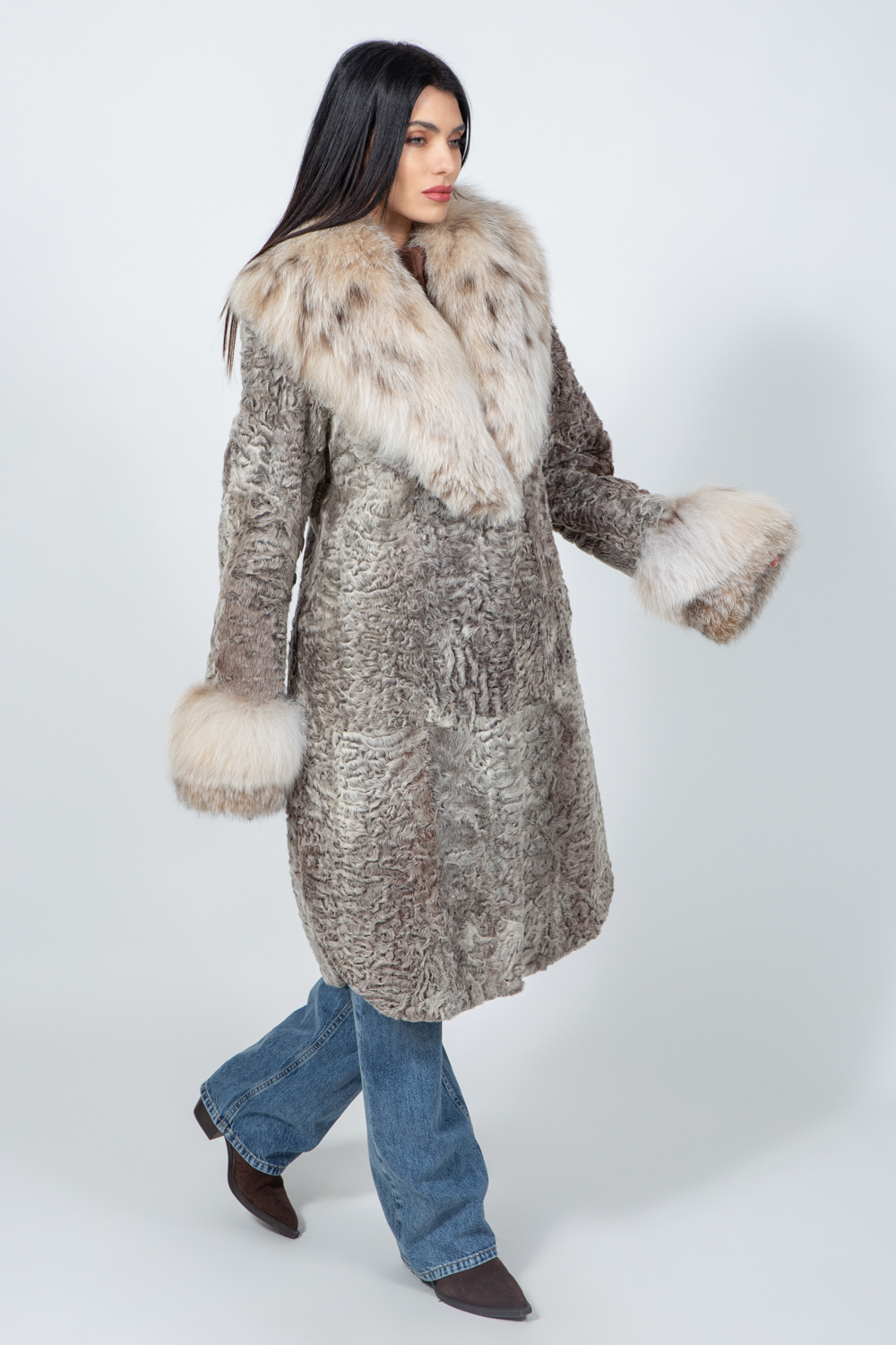 Μακρύ μπουφάν από ασημί αστραχάν και γούνα λύγκα.