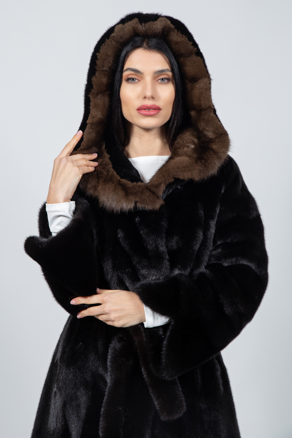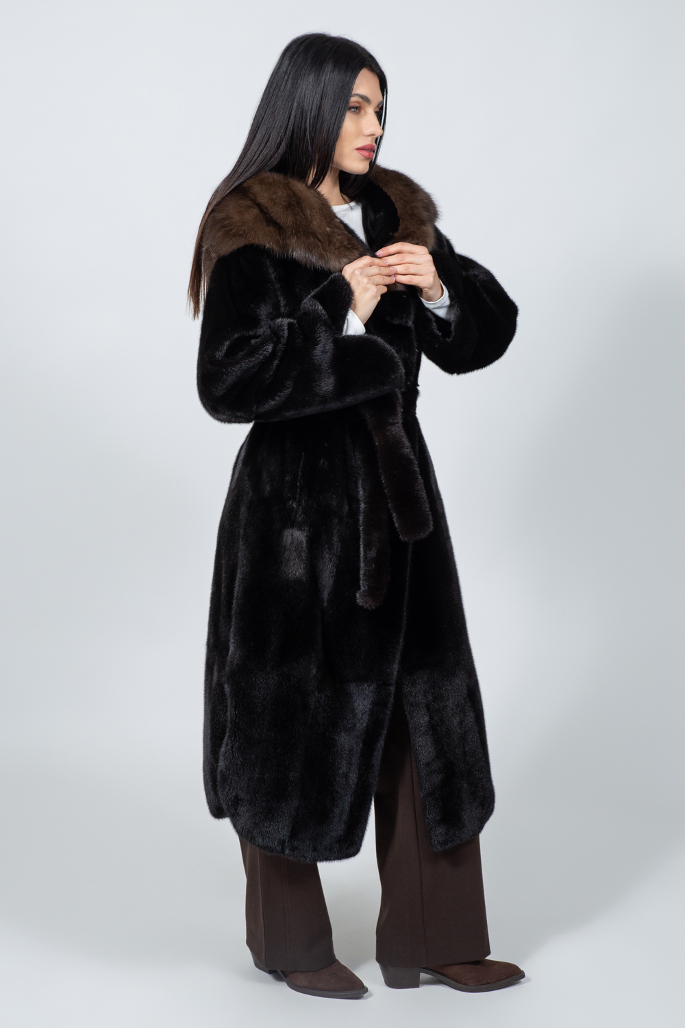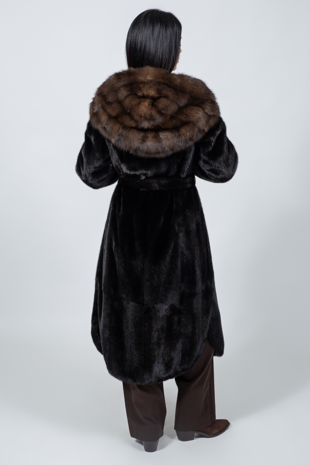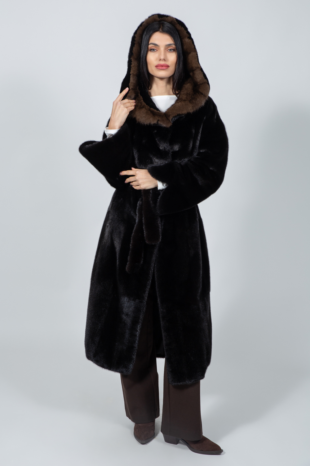 Μπουφάν από γνήσια γούνα ζιμπελίνας και βιζόν σε καφέ απόχρωση, με κουκούλα και ζώνη.
