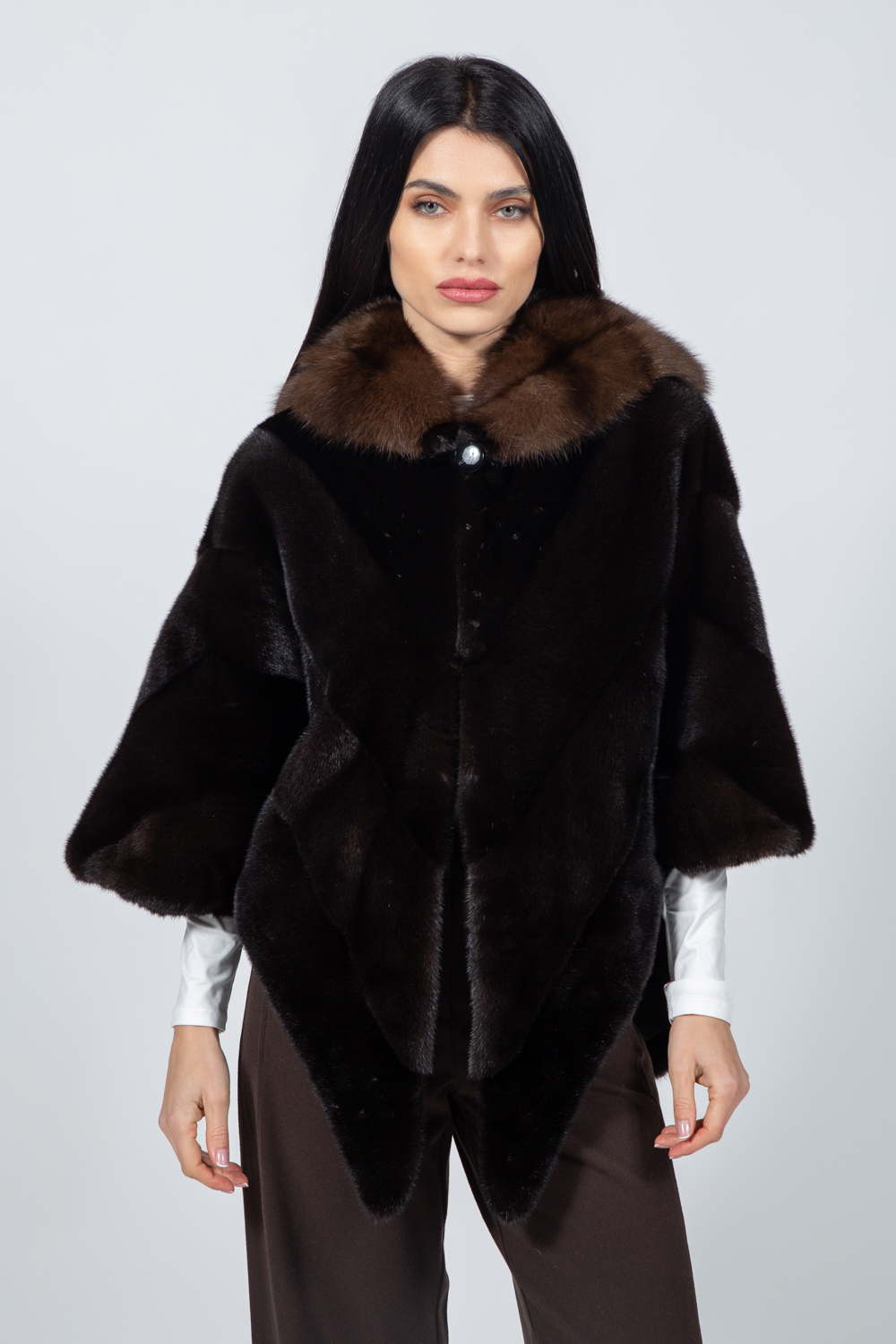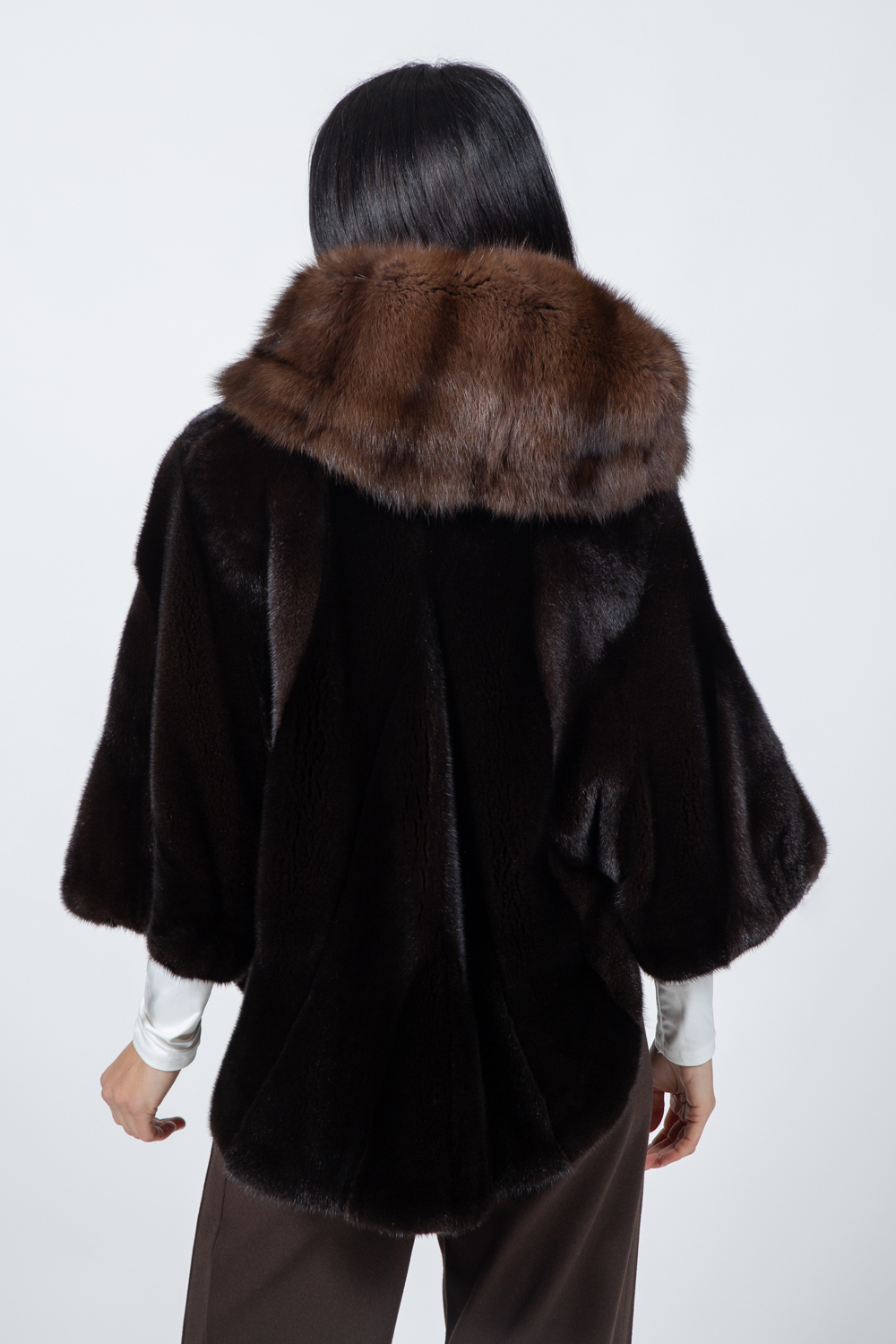Μακρύ καφέ μπουφάν από γούνα βιζόν.