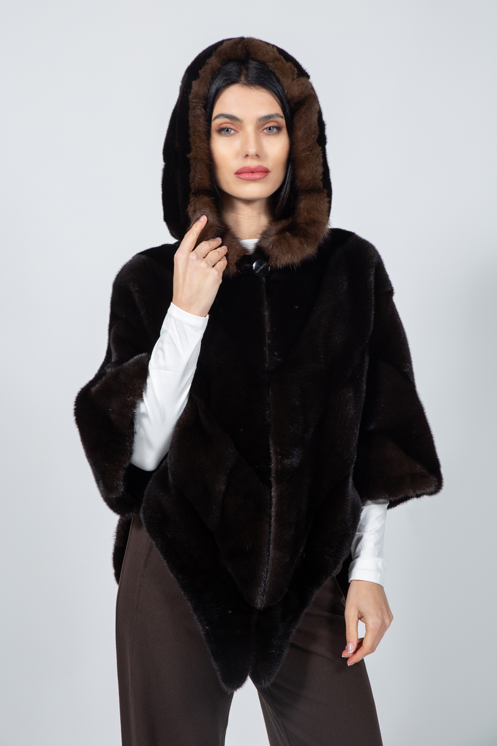 Καφέ μπουφάν από γνήσια γούνα βιζόν με κουκούλα.