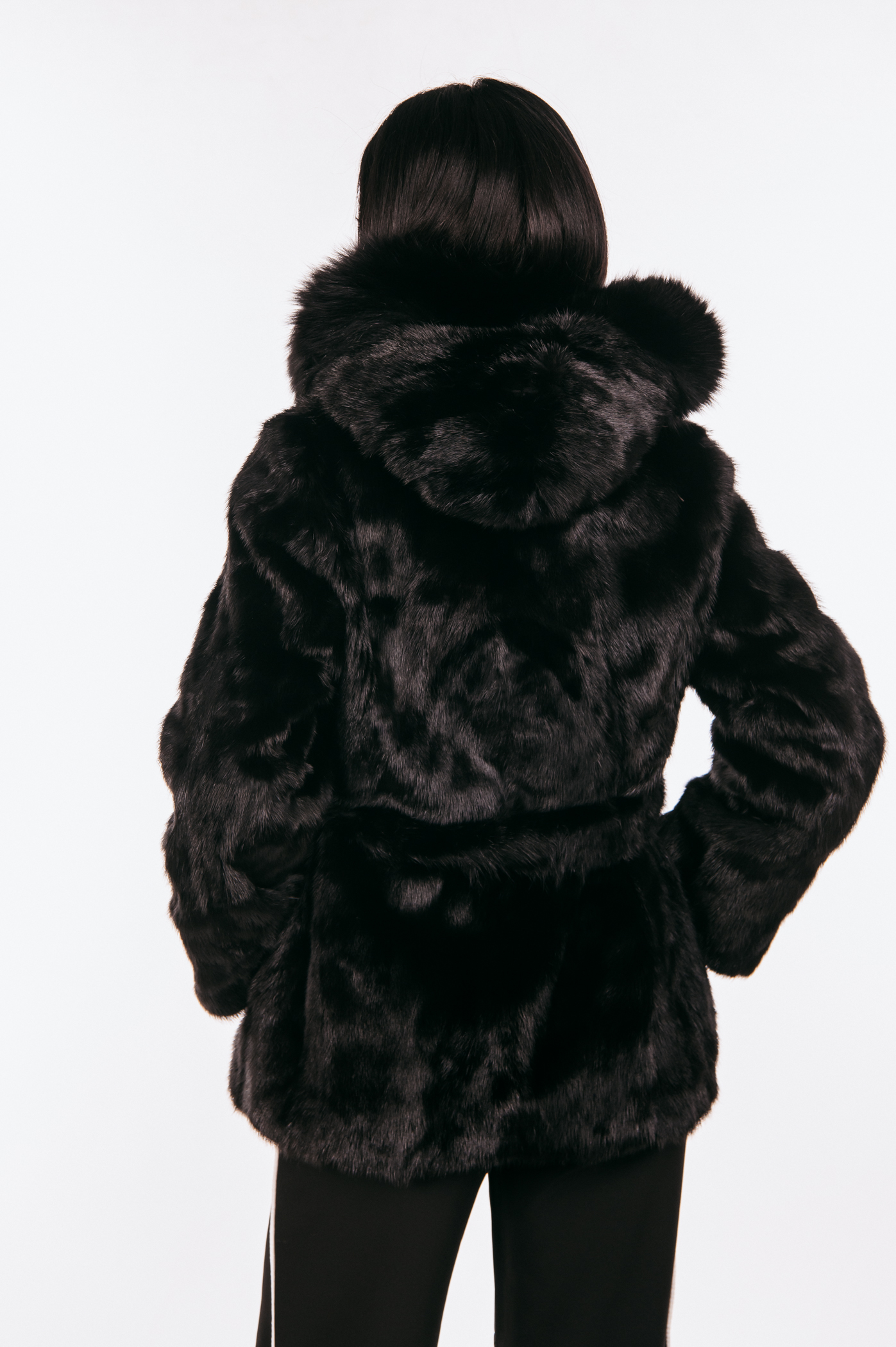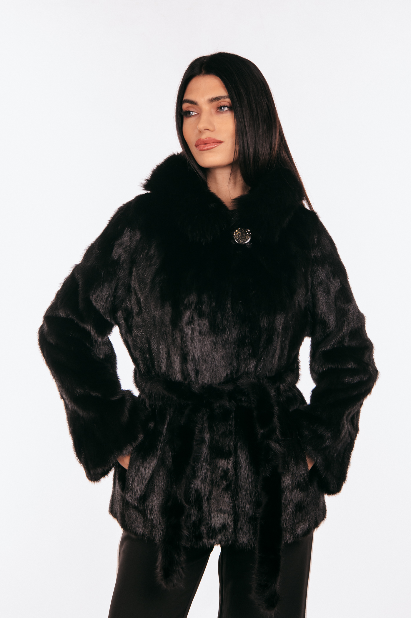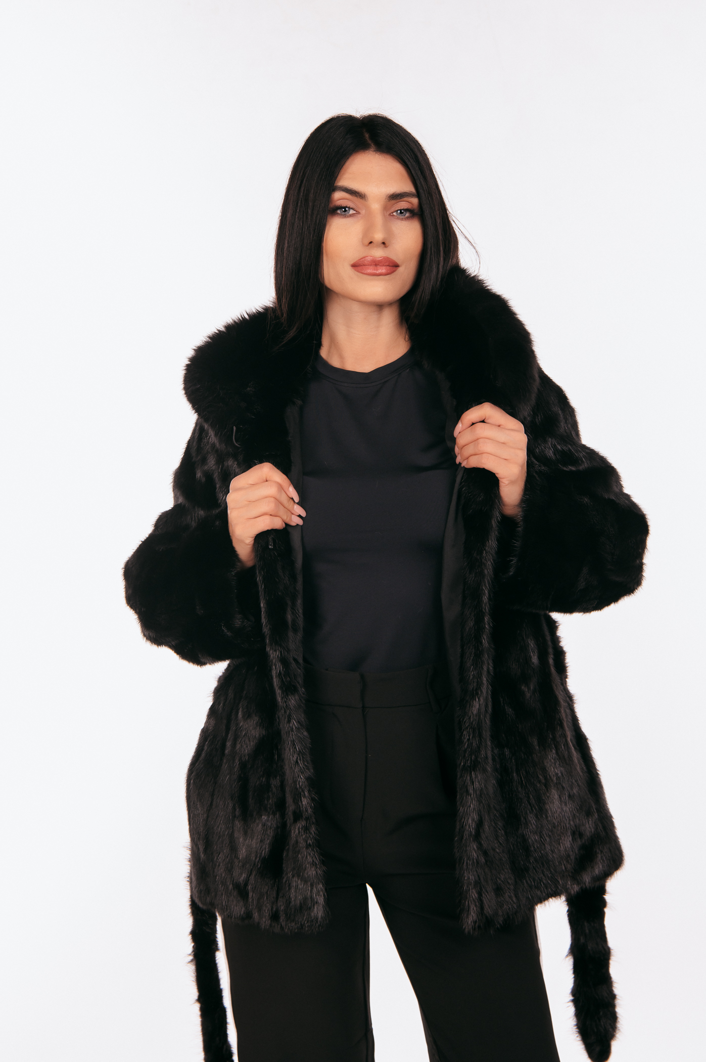 Μαύρο γούνινο τζάκετ μινκ με ζώνη και κουκούλα