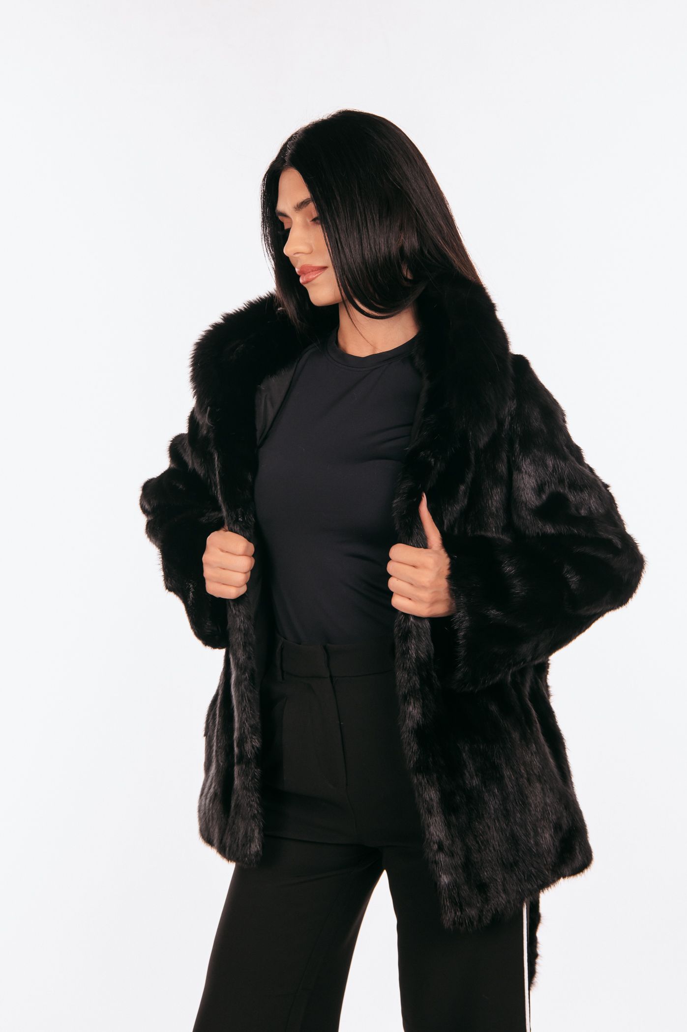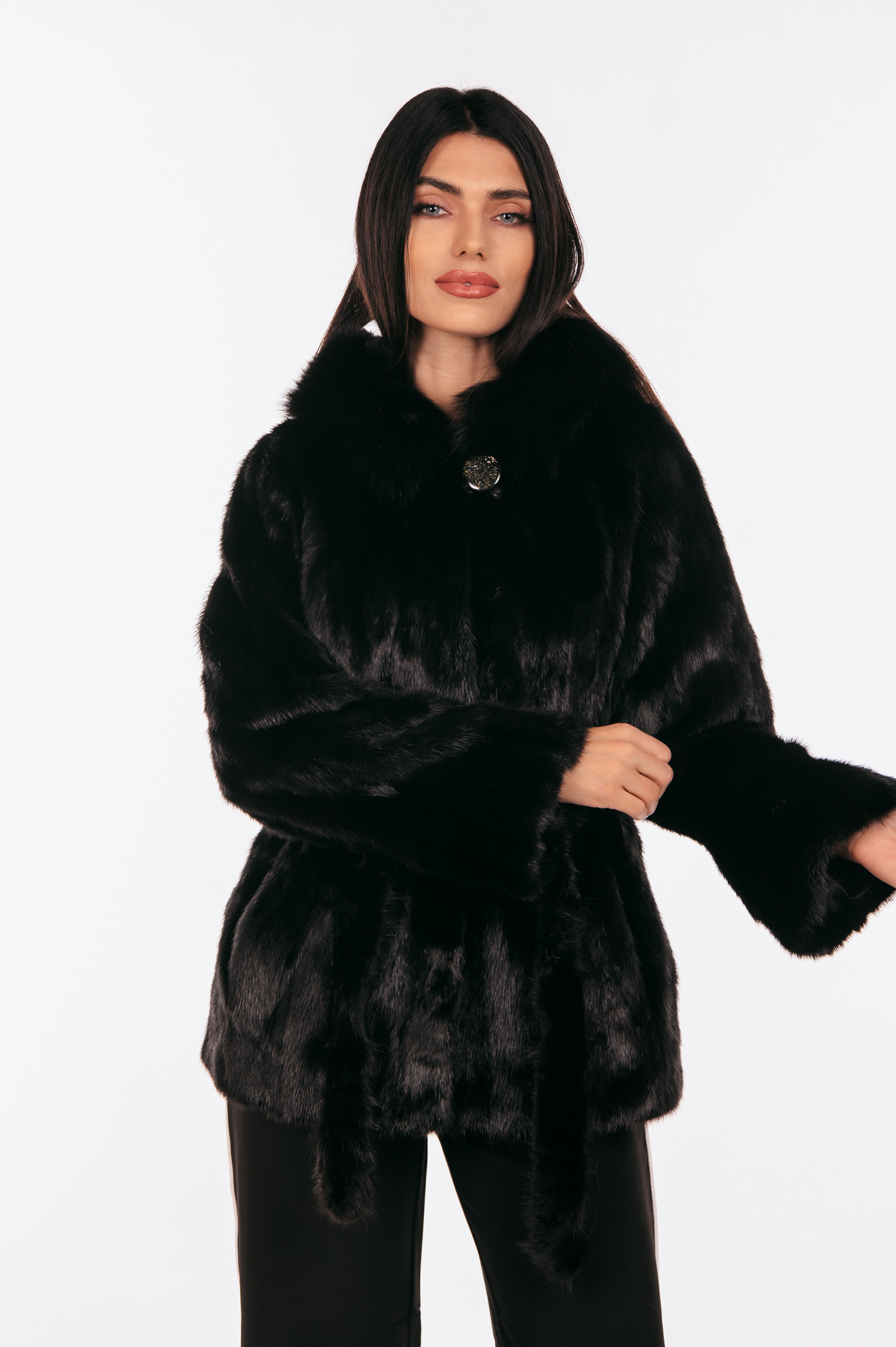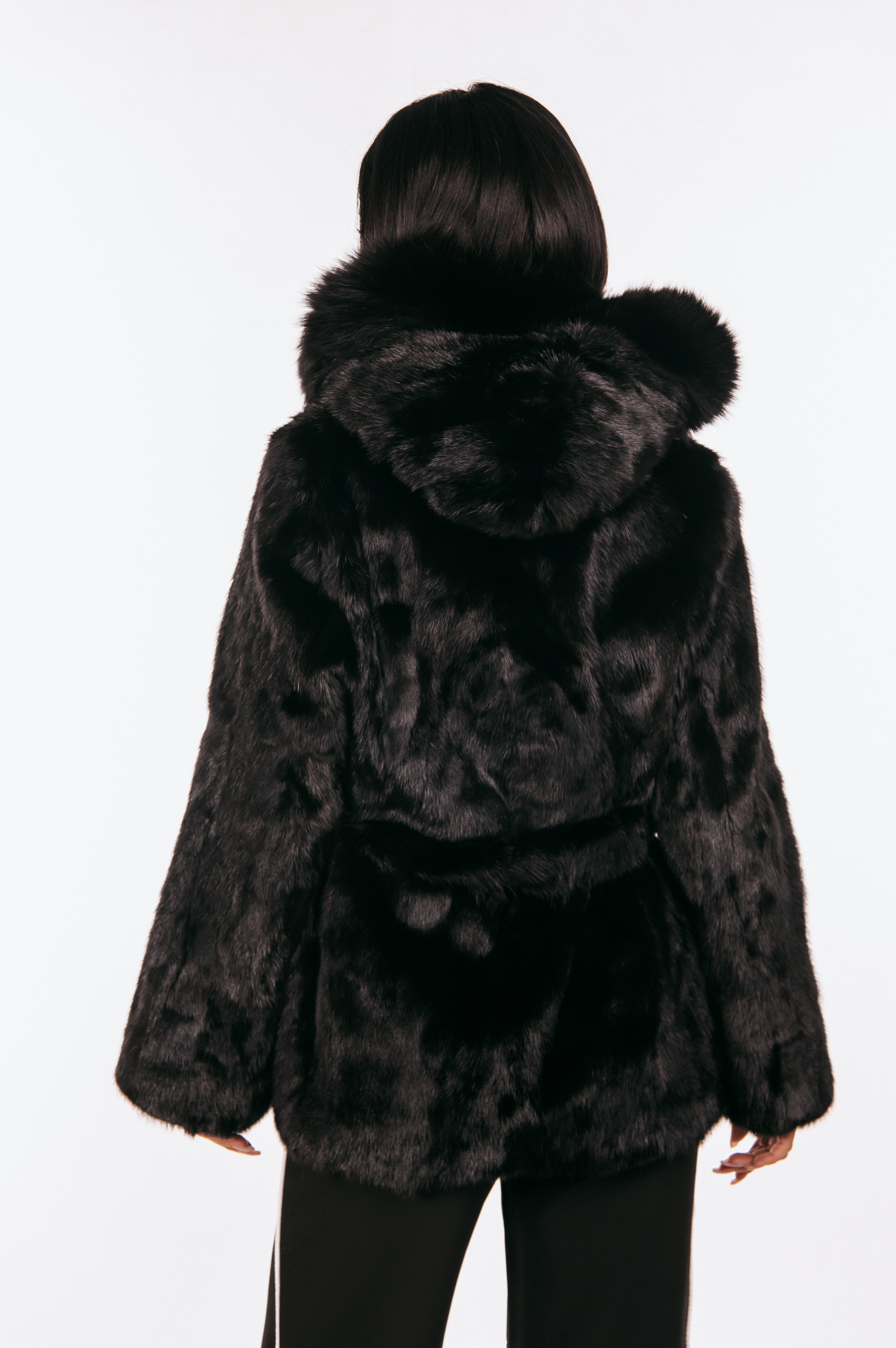 Μαύρο γούνινο τζάκετ μινκ με ζώνη και κουκούλα