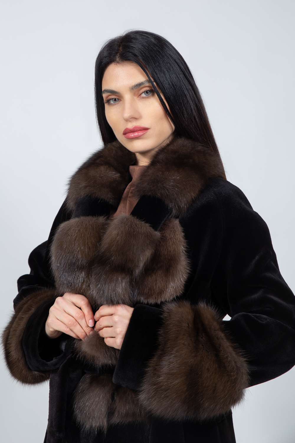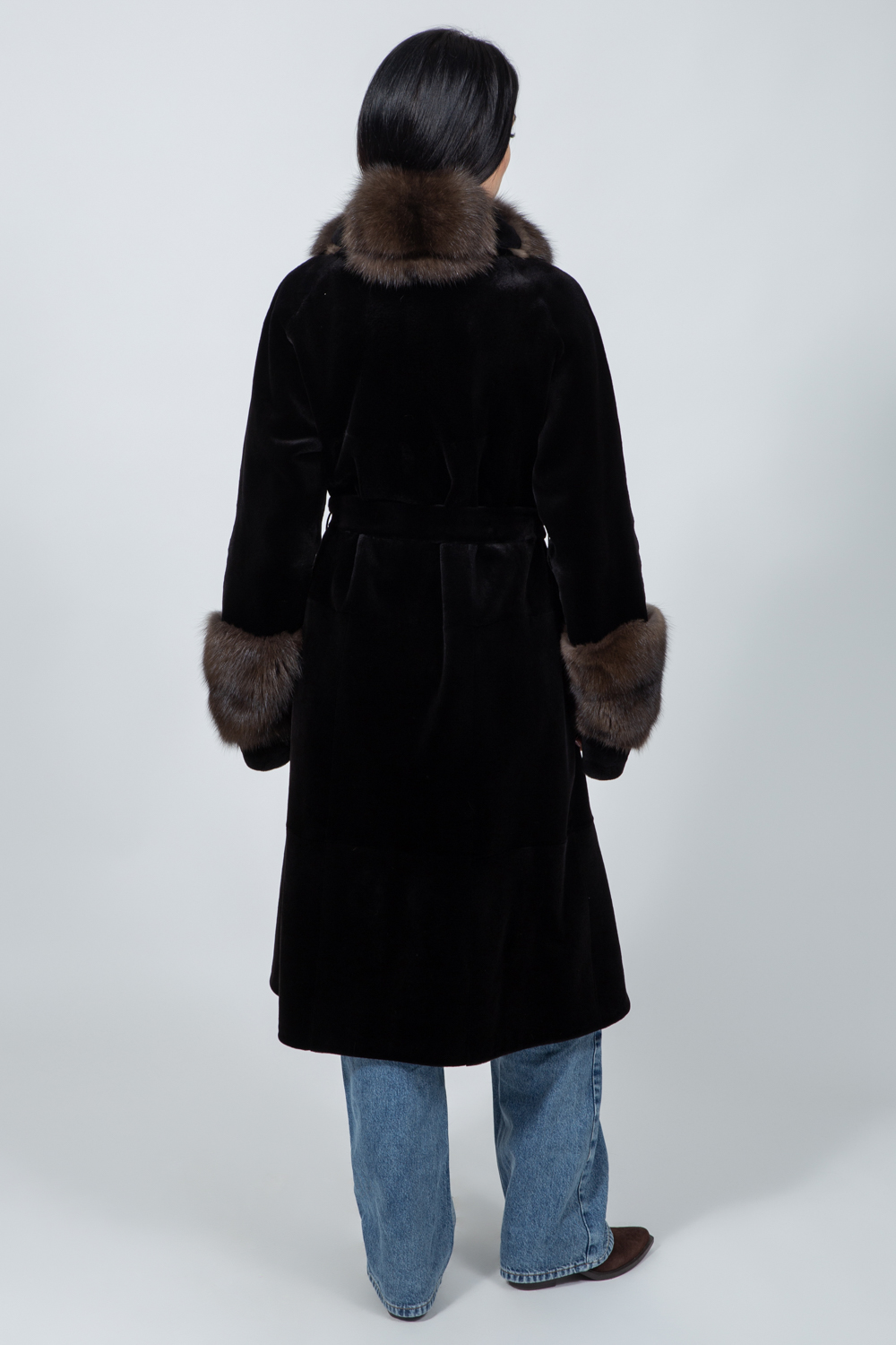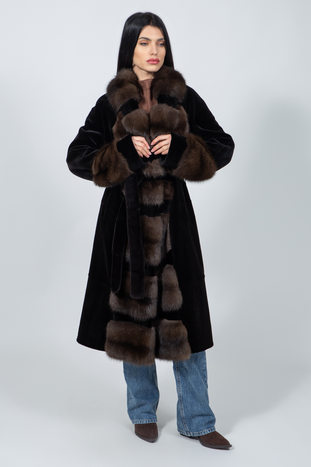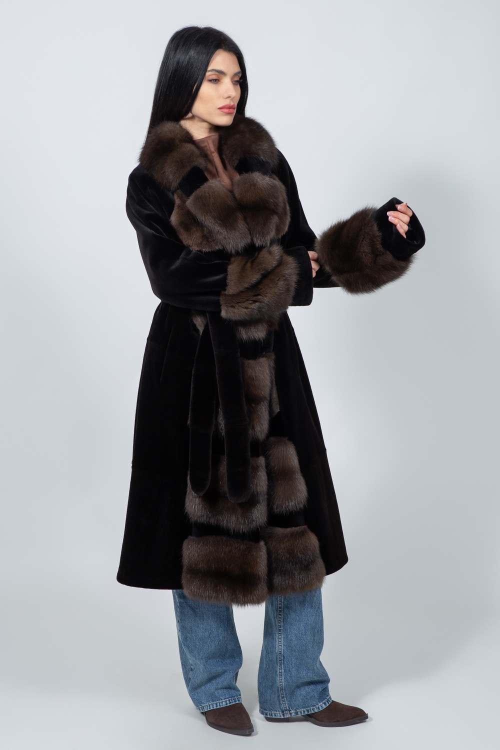 Μακρύ μπουφάν από γούνα ζιμπελίνας και βιζόν σε καφέ απόχρωση, με ζώνη.
