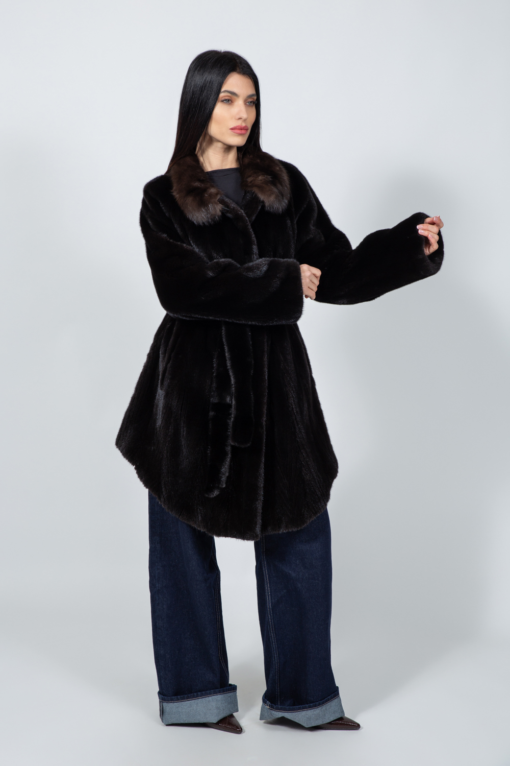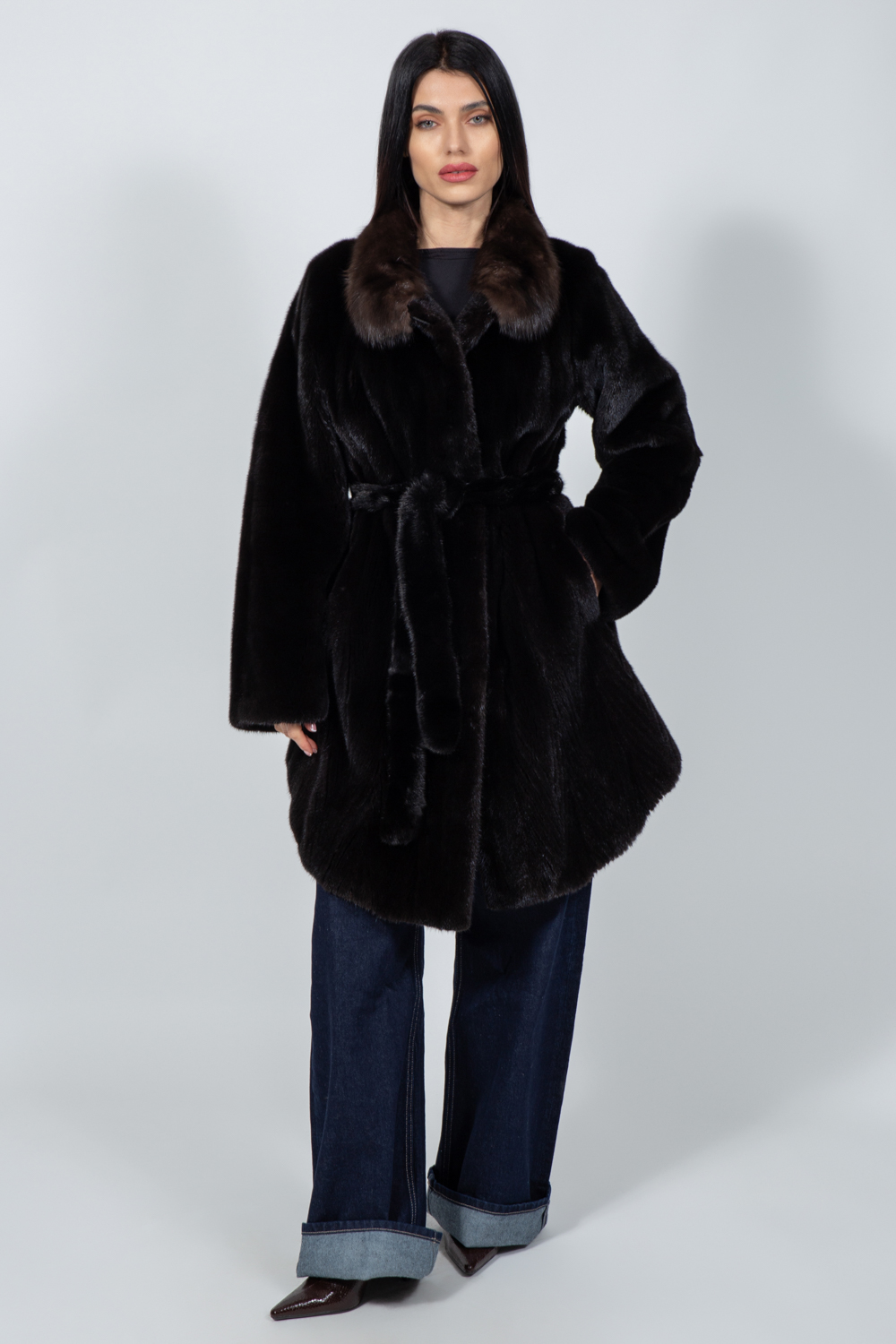 LONG BROWN MINK FUR JACKET WITH A BELT